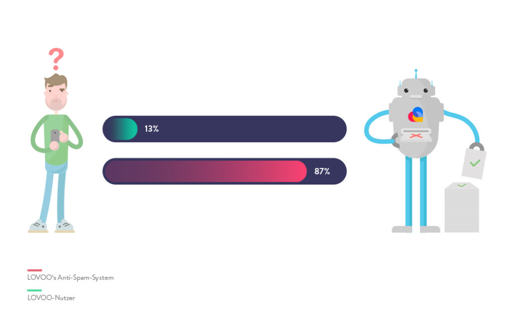 Um mehr Transparenz zu schaffen, veröffentlichen wir regelmäßig Berichte über Spam-Angriffe auf LOVOO sowie deren Verteidigung mithilfe unserer Anti-Spam Algorithmen. Wir werten aus, lernen dazu und erkennen Baustellen, wo wir noch besser werden können. Ausführliches über unsere Anti-Spam Maßnahmen erfährst du in unseren aktuellen Transparency Reports. Im Folgenden haben wir ein paar Zahlen für dich zusammengefasst.